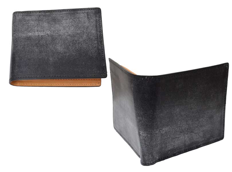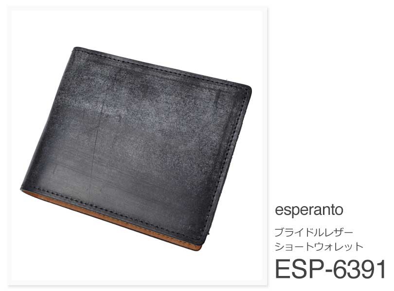 エスペラントのレザーウォレット 「ブライドルレザーショートウォレット」 MADE IN JAPAN 表側に英国"クレイトン社"の きめの細かい繊維質が特徴、表面は薄っすらブルームに覆われ独特のブラッシング跡が残る 最上級部位であるベンズ部位(背中からお尻にかけての部分)を使用、 イタリア、cuoificio M.P.G社の上質なヌメ革を内装に使用し、 裏地部分には国産の牛革を使用したオールレザーの二つ折りの財布 小銭入れはあえて装備せず、 シンプルでスマートに札入れとカード入れのみの作り。