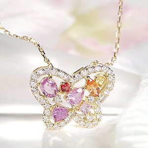 キラキラのダイヤモンドでフチ取られたバタフライモチーフに、希少なカラーサファイアをあしらえたネックレス。
