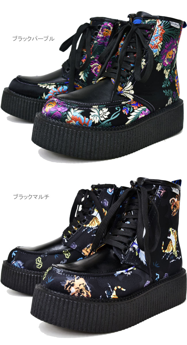 厚底ブーツ モールドソール 編み上げブーツ ショートブーツ ブラック 黒 花柄
